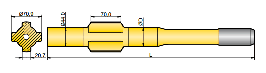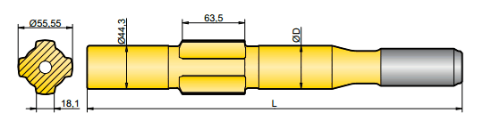 钎尾用于转移钻机和钻杆的能量,一端连接于钻机,一端连接于钻杆,因此钻机的能量就得以传送到钻头,并最终达到掘进的目的。
