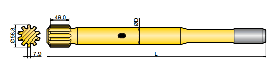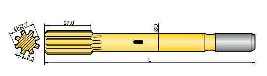 钎尾主要用于矿山作业,选用优质合金钢作为原材料,经过整体渗碳处理。采用专用的数控机床加工设备和加工工艺流程确保尾部细节、内部水孔和侧水孔加工质量。钎尾经过均匀热处理,使用精密仪器科学矫直,保证钎尾平直与抗躁性。